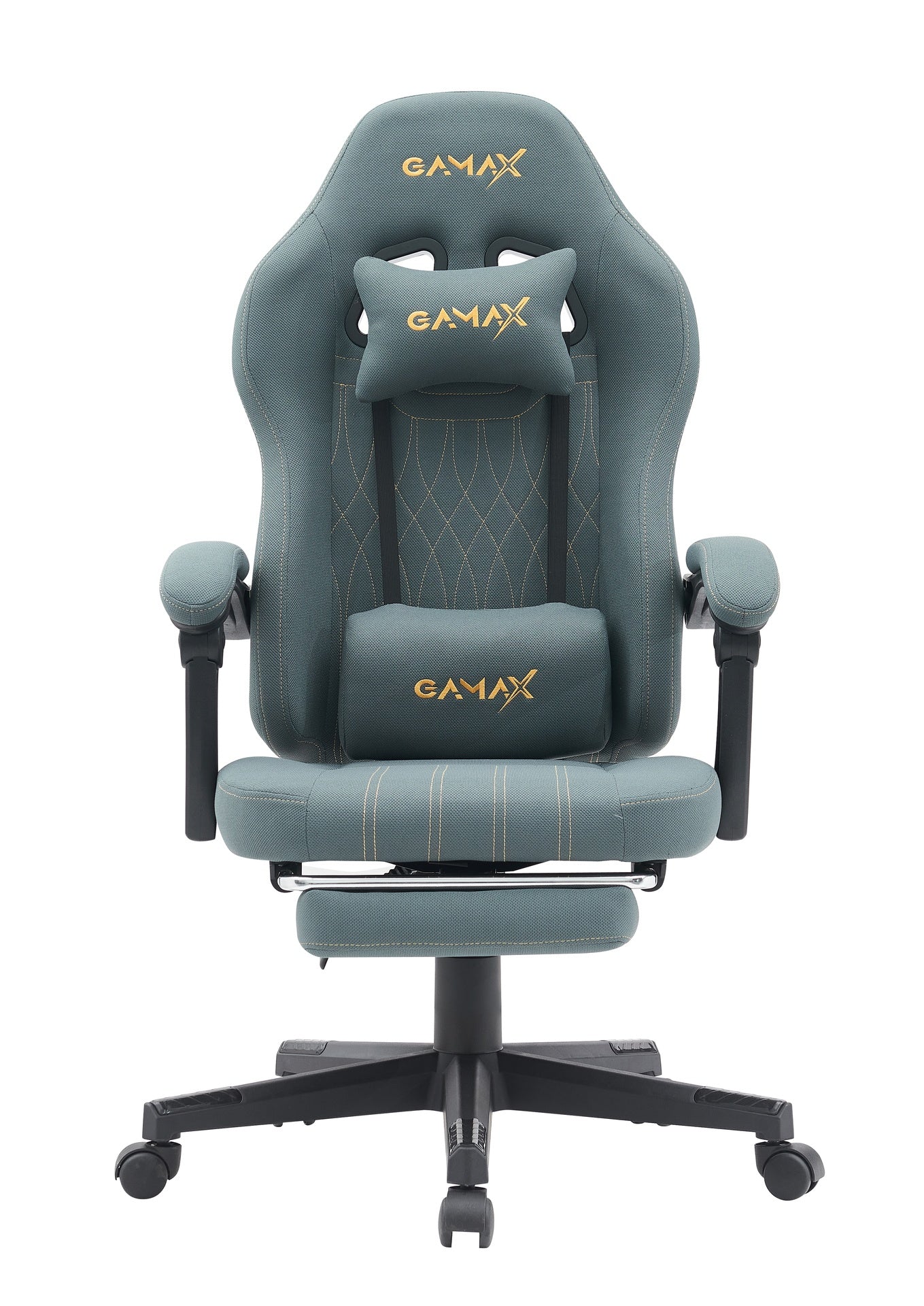 Constructed with a wood frame and recycled foam, the Gamax Model BS-6306 Adjustable Fabric Gaming Chair offers lumbar support and a foot rest for added comfort. The grey upholstery is not only stylish but also made of durable fabric.